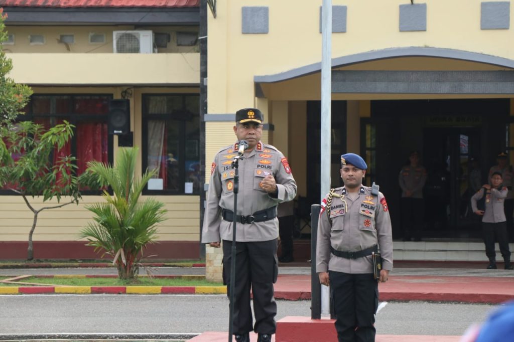 Apel gelar pasukan Operasi Moskona AB 2025 digelar di Mapolres Teluk Bintuni, Selasa (22/4/2025), dipimpin Kapolda Papua Barat, Irjen Johnny Eddizon Isir. Ia mengingatkan personel agar menjunjung tinggi Catur Prasetya Polri dan siap berkorban demi bangsa.