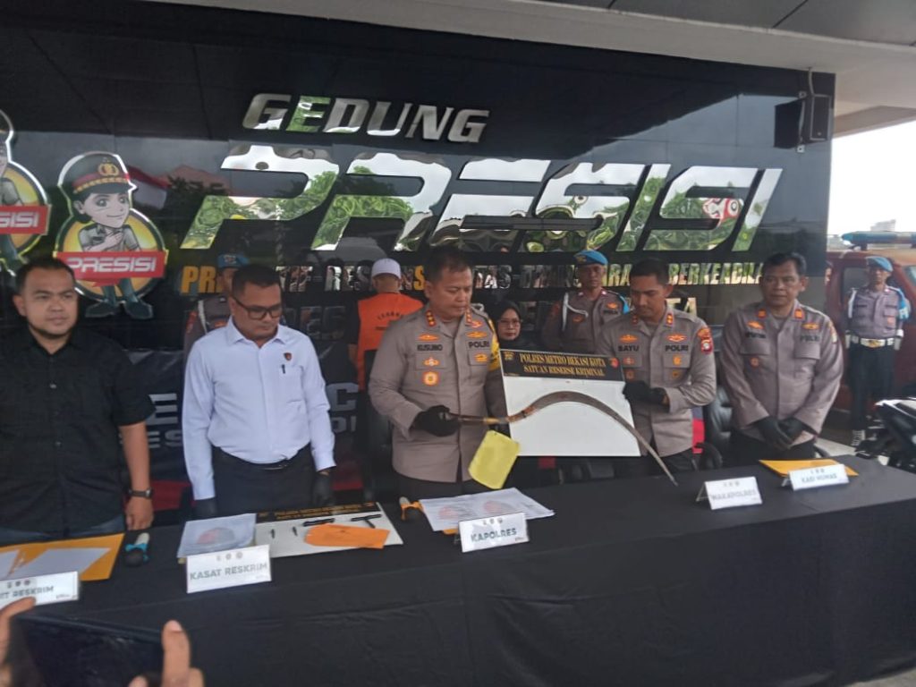 BEKASI KOTA GANTARITV.COM – Kapolres Metro Bekasi Kota Kombes Pol Kusumo Wahyu Bintoro, S.H., S.I.K., M.H., didampingi Wakapolres AKBP Bayu Pratama Gubunagi, S.H., S.I.K., M.Si., Kasat Reskrim AKBP Braiel Arnold Rondonuwu, dan Kasi Humas AKP Suparyono menggelar konferensi pers pengungkapan kasus kepemilikan senjata tajam tanpa izin pada Senin (3/11/2025).