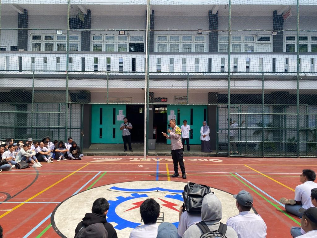 GANTARITV.COM Bekasi Barat – Polsek Bekasi Barat melalui Bhabinkamtibmas Bintara Aipda Tedy Rivaldi, melakukan Sosialisasi dan Penyuluhan tentang bahaya penyalahgunaan narkoba, kenakalan remaja dan Stop Tawuran di SMK Bina Mandiri Jalan Bintara 9 RT.02 RW.05 Kelurahan Bintara Kecamatan Bekasi Barat Kota Bekasi, (16/4).