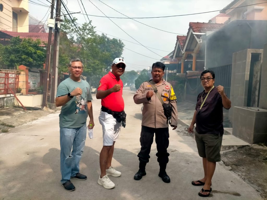 GANTARITV.COM Kota Bekasi — Bhabinkamtibmas Kelurahan Pejuang, Aipda Slamet, melaksanakan kegiatan kerja bakti fogging di lingkungan Perumahan THB, RT 04/RW 026, Kelurahan Pejuang, Kecamatan Medan Satria, Kota Bekasi, pada Senin (14/4/2025).