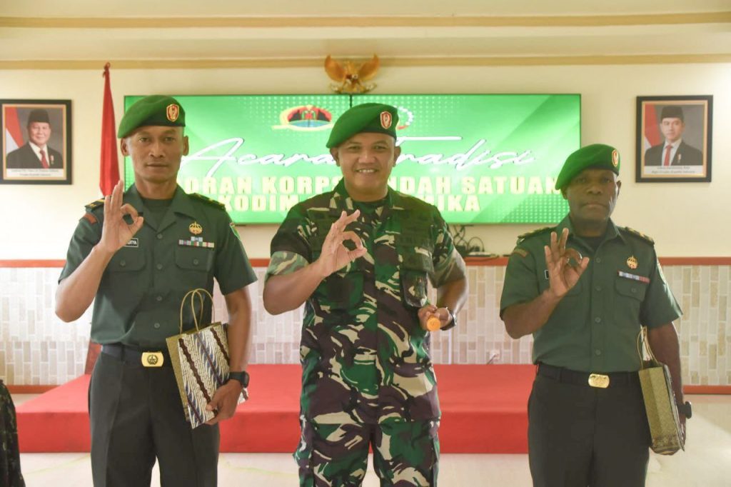 Timika – Komandan Kodim 1710/Mimika, Letkol Inf M. Slamet Wijaya, S.Sos., M.Han., M.A. memimpin acara tradisi laporan korps pindah satuan di Ruang Rekreasi Kodim 1710/Mimika, Distrik Kuala Kencana, Kabupaten Mimika, Jumat (25/07/2025). Pada kesempatan ini Letda Inf Wahyudi Aditya dan Letda Inf Moso Kogoya yang baru selesai melaksanakan pendidikan Secapa akan dilepas ke Kodam XVII/Cenderawasih sebelum nantinya akan ditempatkan di satuan yang baru.
