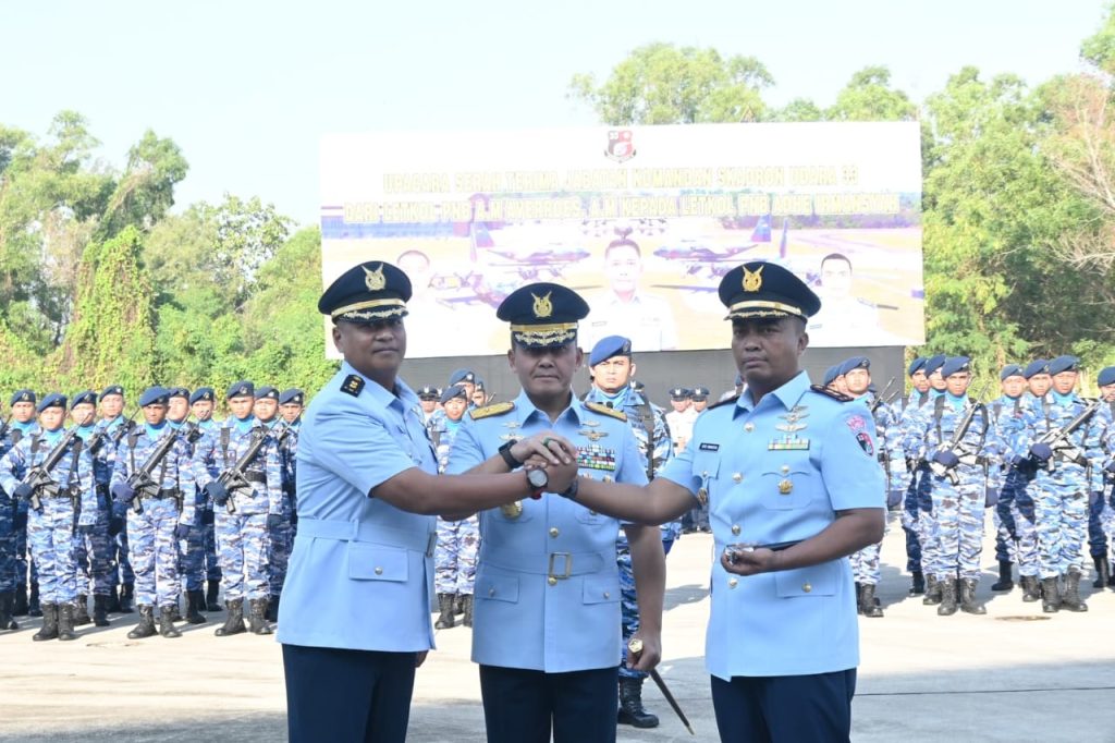 Makassar – Komandan Lanud Sultan Hasanuddin, Marsekal Pertama TNI Arifaini Nur Dwiyanto, M.Han., memimpin upacara serah terima jabatan (Sertijab) Komandan Skadron Udara 33 di Apron Skadron Udara 33 Lanud Sultan Hasanuddin, Makassar, Rabu (8/10/2025).