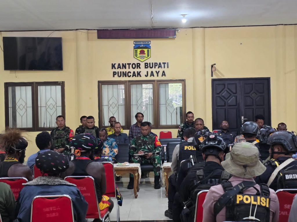 Puncak Jaya – Komandan Satuan Tugas (Dansatgas) Kewilayahan Yonif 715/Motuliato Letkol Inf Prawito hadir di tengah-tengah warga, melaksanakan monitoring jalannya pertemuan mediasi penyelesaian konflik antar pendukung Calon Pasangan (Paslon) Bupati dan Wakil Bupati Kabupaten Puncak Jaya, yang berlangsung di Kantor Bupati Puncak Jaya, Jalan Andreas Come Distrik Pagaleme Kabupaten Puncak Jaya, Provinsi Papua Tengah, Kamis (8/5/2025).