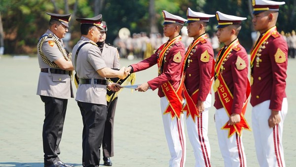 Jakarta – Kapolri Jenderal Listyo Sigit Prabowo memberikan penghargaan kepada taruna berprestasi dalam upacara penutupan pendidikan Akademi Polisi (Akpol). Jenderal Sigit menyerahkan penghargaan kepada angkatan ke-56 Batalyon Presisi dan angkatan ke-57 Batalyon Adhi Wiratama.