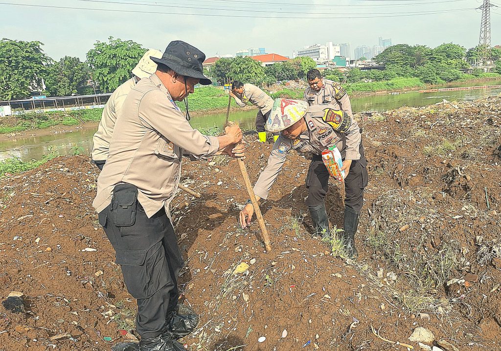 GANTARITV.COM Jakarta Pusat – Dalam upaya menjaga ketahanan Pangan Kapolsek Metro Tanah Abang AKBP Aditya S.P Sembiring M, Sik melakukan penanaman Jagung di Bantaran Kali Ciliwung Jalan Tenaga Listrik RW 16 Kelurahan Kebon Melati Kecamatan Tanah Abang Jakarta Pusat. Minggu (22/12/2024).