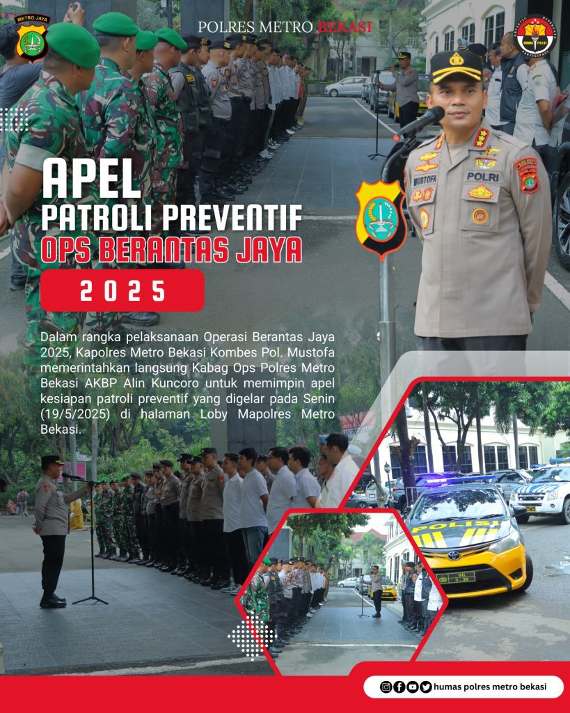 Bekasi – Guna mendukung pelaksanaan Operasi Berantas Jaya 2025, Kapolres Metro Bekasi Kombes Pol Mustofa menugaskan Kabag Ops AKBP Alin Kuncoro untuk memimpin langsung apel kesiapan patroli preventif di halaman Loby Mapolres Metro Bekasi, Senin (19/5/2025).