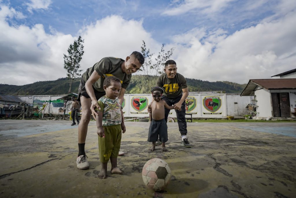 Di tengah udara sejuk pegunungan Papua dan hembusan angin yang membawa kedamaian, anak-anak tampak ceria dan bersemangat saat mengikuti latihan dan permainan sepak bola yang dipandu langsung oleh personel Satgas.