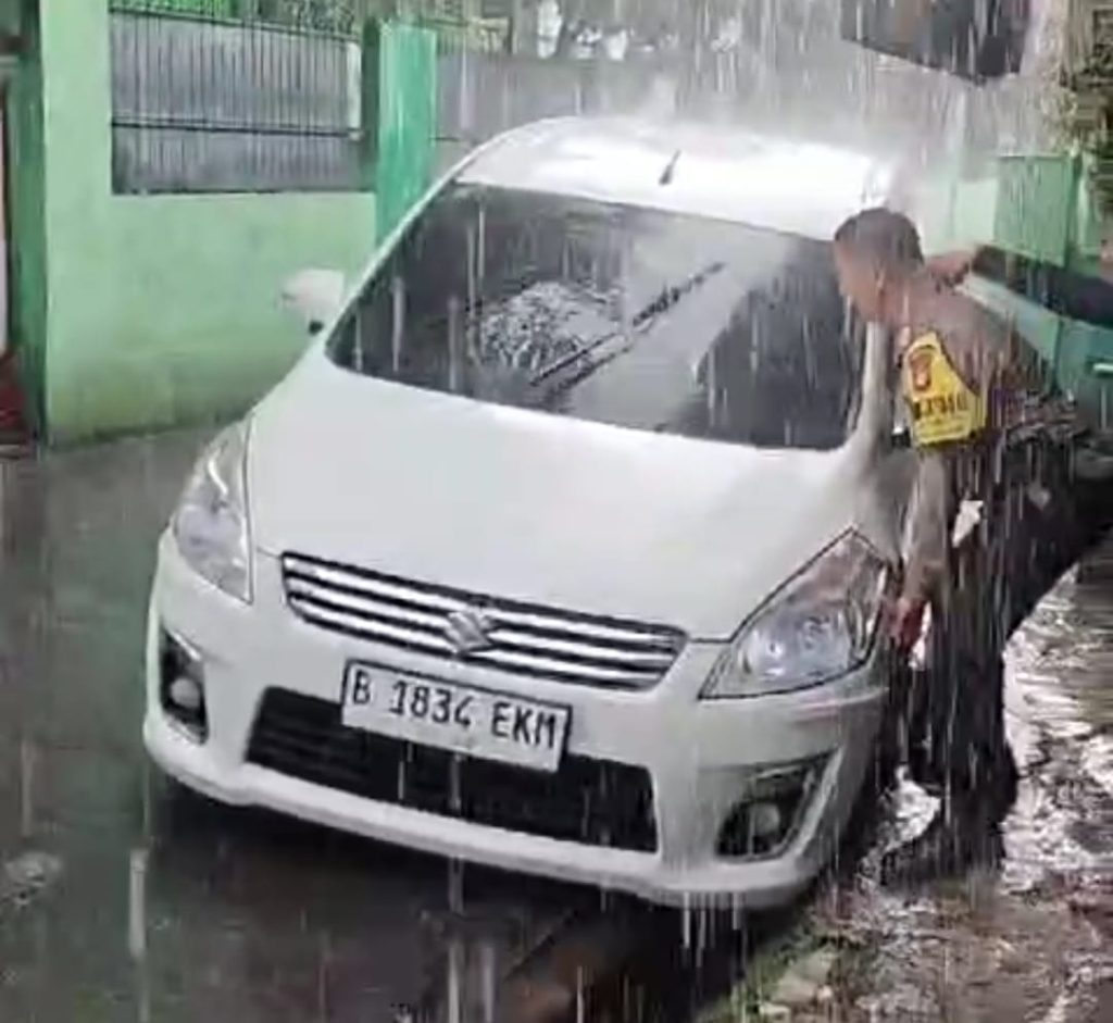 Saat melaksanakan patroli rutin di wilayahnya, Bhabinkamtibmas Jakamulya melihat seorang warga yang kesulitan menyeberang jalan akibat hujan deras dan genangan air. Tanpa ragu, ia segera turun tangan membantu warga tersebut agar dapat menyeberang dengan aman.