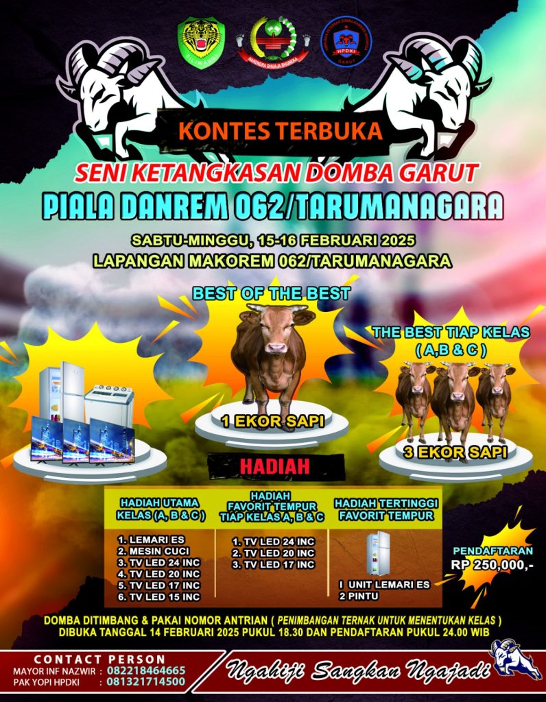 GANTARITV.COM (Puspen TNI) – Dalam rangka melestarikan kearifan lokal dan memperkuat kemanunggalan TNI dengan rakyat, Korem 062/Tarumanagara akan menyelenggarakan Kontes Terbuka Seni Ketangkasan Domba Garut Piala Danrem 062/Tarumanagara. Acara ini akan digelar pada Sabtu-Minggu, 15-16 Februari 2025, bertempat di Lapangan Makorem 062/Tarumanagara, Jawa Barat, Rabu (12/02/2025).