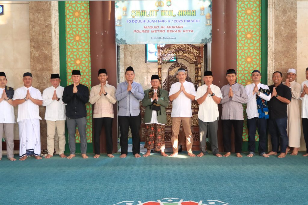 Bekasi Kota – Suasana khidmat dan penuh kebersamaan menyelimuti pelaksanaan Shalat Idul Adha 10 Dzulhijjah 1446 H yang digelar di Masjid Al Mukmin, Polres Metro Bekasi Kota, Kamis pagi (6/6/2025). Ratusan jamaah, terdiri dari anggota Polri, PNS, dan masyarakat sekitar, memadati masjid untuk melaksanakan shalat yang dimulai pukul 06.45 WIB.