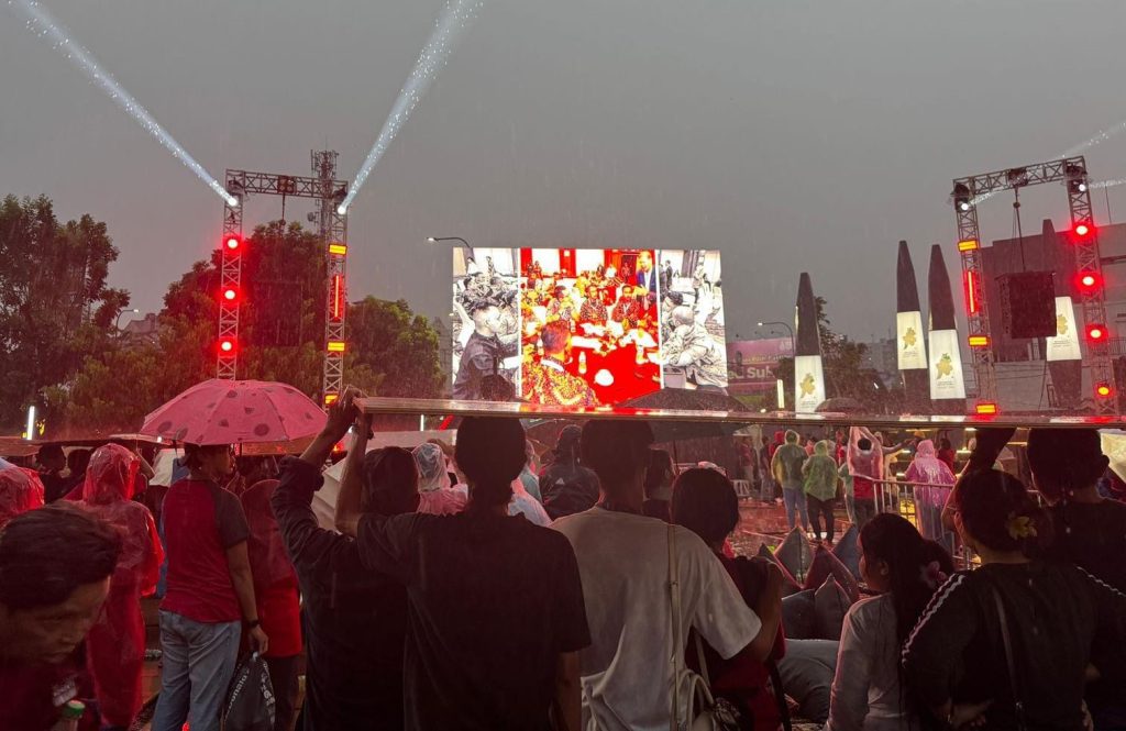 Pertandingan dimulai tepat pukul 17.35 WIB dengan kick-off babak pertama. Namun, pada pukul 17.45 WIB, cuaca kurang bersahabat dengan diturunkannya hujan deras yang mengguyur area Plaza Patriot Candrabhaga. Meskipun demikian, semangat masyarakat untuk mendukung Timnas tetap tidak surut. Mereka tetap bertahan di lokasi nonton bareng, menggunakan jas hujan maupun berteduh di area yang tersedia.