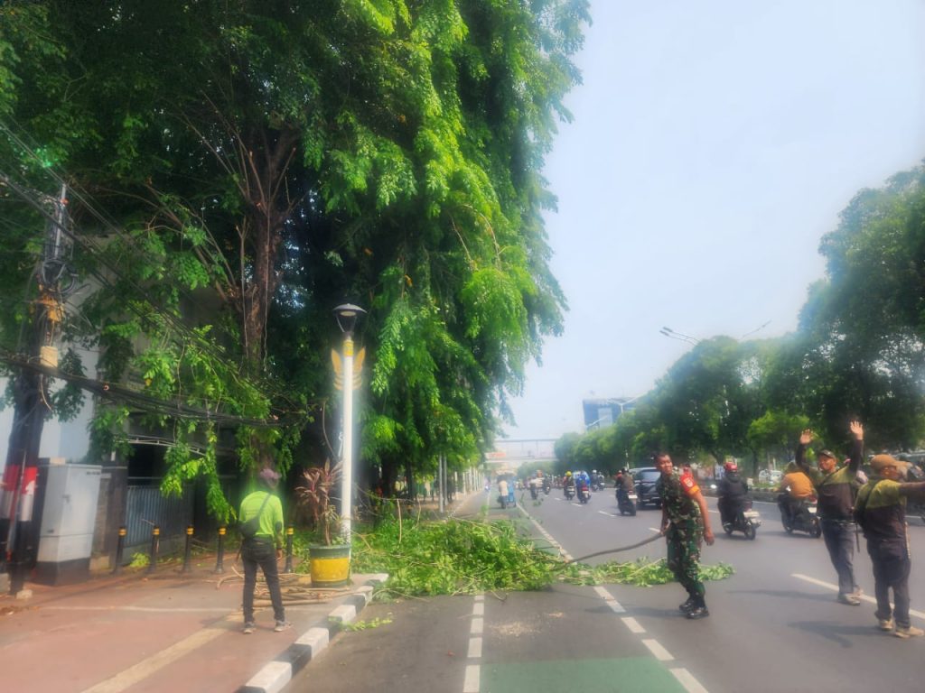 GANTARITV.COM Jakarta Timur – Babinsa Koramil 02/Matraman Sertu Yudi, Serda Muhammad bersama Dinas Pertamanan dan Hutan Kota Administrasi Jakarta Timur melakukan Toping Pohon guna menghindari dahan patah atau pohon tumbang akibat daun terlalu rimbun, lokasi Jln. Raya Matraman RT.08/04 Kelurahan Kebon Manggis, Kecamatan Matraman, Selasa, (21/01/25).