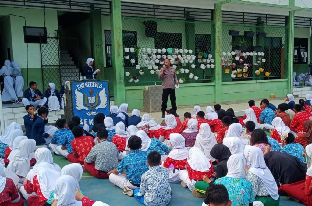 Kota Bekasi — Dalam upaya mencegah kenakalan remaja di kalangan pelajar, Kanit Binmas Polsek Bekasi Selatan, Iptu Sadino, didampingi Bhabinkamtibmas Aiptu Triyugo, melaksanakan kegiatan penyuluhan kepada para siswa-siswi SMP Negeri 4 Bekasi yang sedang mengikuti Masa Pengenalan Lingkungan Sekolah (MPLS). Kegiatan ini berlangsung di aula sekolah yang berlokasi di Jl. Komodo Raya, Kelurahan Kayuringin Jaya, Kecamatan Bekasi Kota.