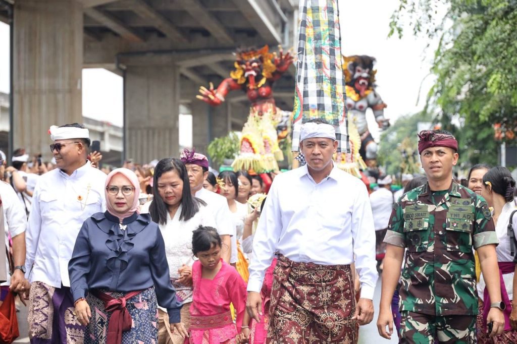 Wali Kota Bekasi, bersama Dandim 0507 Bekasi dan Ketua TP PKK Kota Bekasi, turut serta dalam pawai ogoh-ogoh bersama umat Hindu sebagai bentuk solidaritas dan penghormatan terhadap keberagaman budaya dan keyakinan di Kota Bekasi.