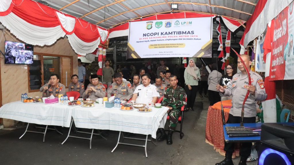Jakarta Pusat – Polres Metro Jakarta Pusat bersama jajaran Polda Metro Jaya menggelar kegiatan Ngopi Kamtibmas di Pos Satkamling RW 04, Kelurahan Kebon Kelapa, Kecamatan Gambir, Jakarta Pusat, Rabu (30/7/2025) malam.