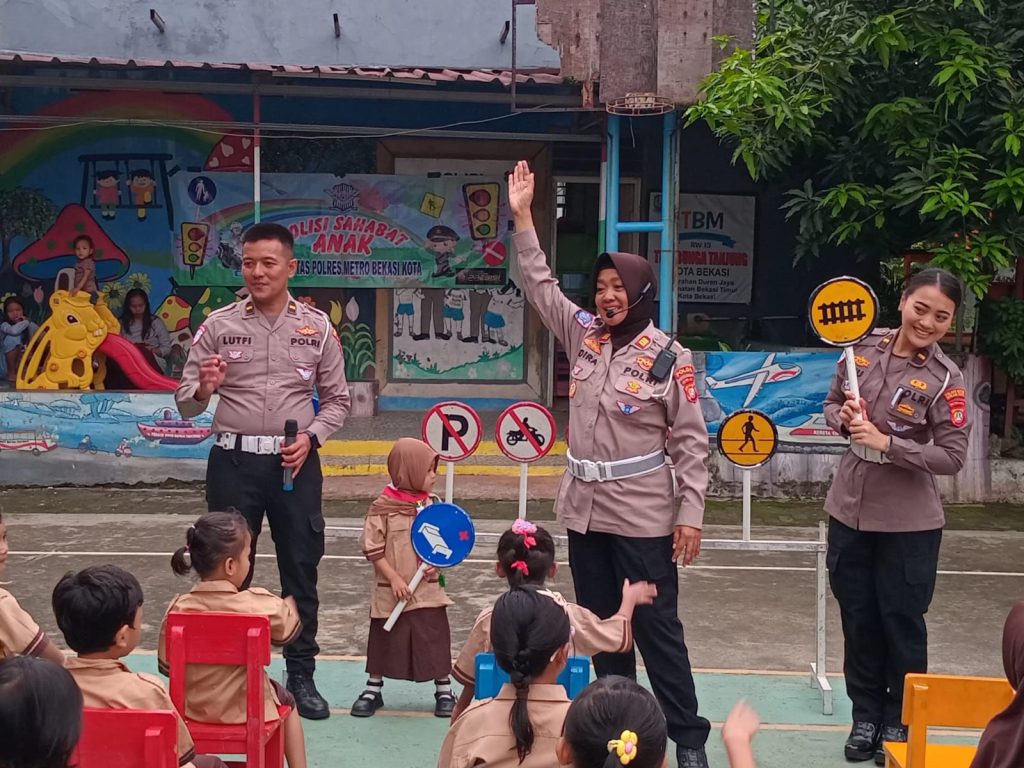 Kegiatan ini dipimpin langsung oleh Wakasat Lantas Polres Metro Bekasi Kota, AKP Sri Indira, yang dengan penuh kehangatan memberikan edukasi kepada anak-anak usia dini mengenai pentingnya memahami tugas dan peran polisi lalu lintas serta dasar-dasar keselamatan di jalan raya.