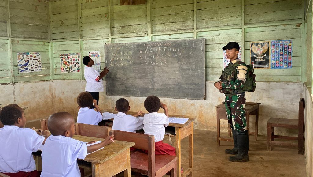 Boven Digoel – Di Kampung Upkim prajurit TNI hadir sebagai penggerak perubahan di bidang pendidikan. Melalui peran mereka sebagai tenaga pengajar di SD YPPK Fransiskus Xaverius Dumuy Upkim, Senin (25/8/2025), para prajurit membantu guru untuk mengajar, serta menanamkan semangat kebangsaan dan karakter positif kepada generasi muda. Kehadiran mereka di ruang kelas menjadi bukti nyata pengabdian yang melampaui tugas pokok pertahanan negara.