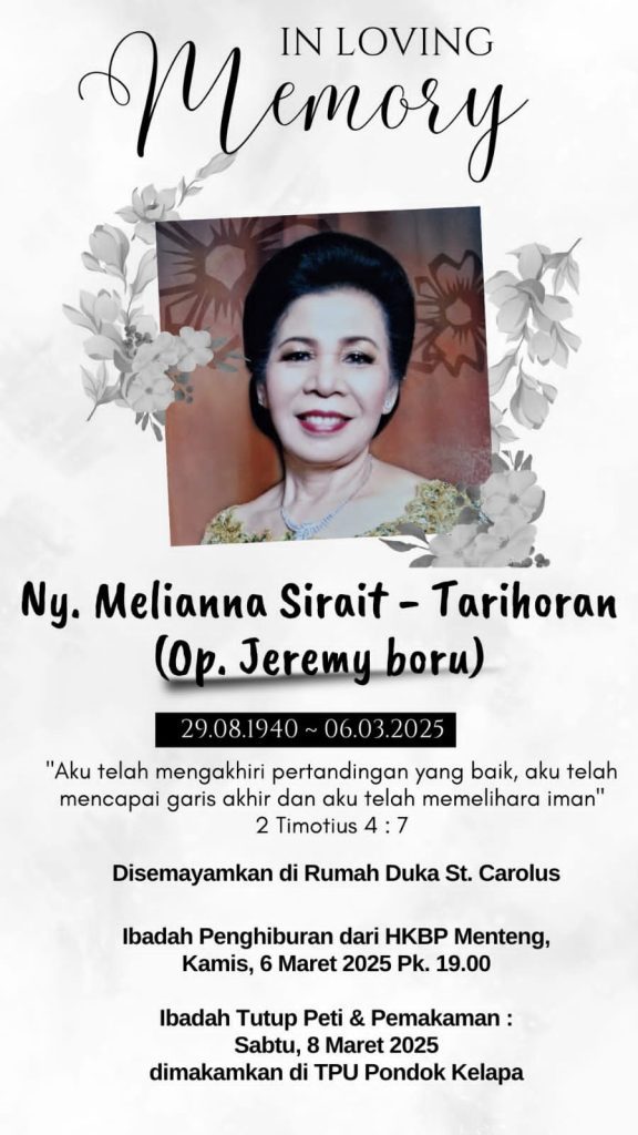 Acara Adat Saor Matua dan dikebumikan pada hari Sabtu, 8 Maret 2025, WIB dari Rumah Duka St.Carolus Lt 8 l, Ruangan Mikael A Mikael B Jakarta Pusat ke TPU Pondok Kelapa Jakarta Timur.