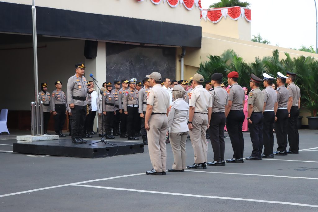 Upacara dipimpin langsung oleh Kapolres Metro Bekasi Kota, Kombes Pol Kusumo Wahyu Bintoro, S.H., S.I.K., M.H., didampingi Wakapolres AKBP Bayu Pratama Gubunagi, S.I.K., M.Si, para pejabat utama, para Kapolsek jajaran, serta Bhayangkari Cabang Kota Bekasi.