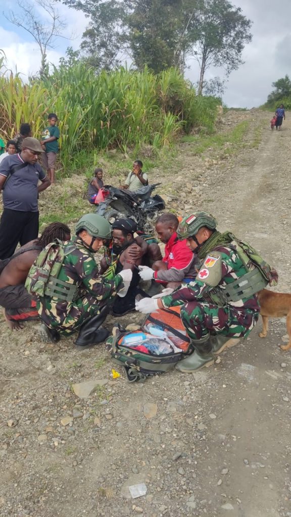 Sigap, Satgas Yonif 715/Motuliato Berikan Pertolongan Kepada Masyarakat Yang Mengalami Kecelakaan, di Jalan Trans Mulia - Sinak