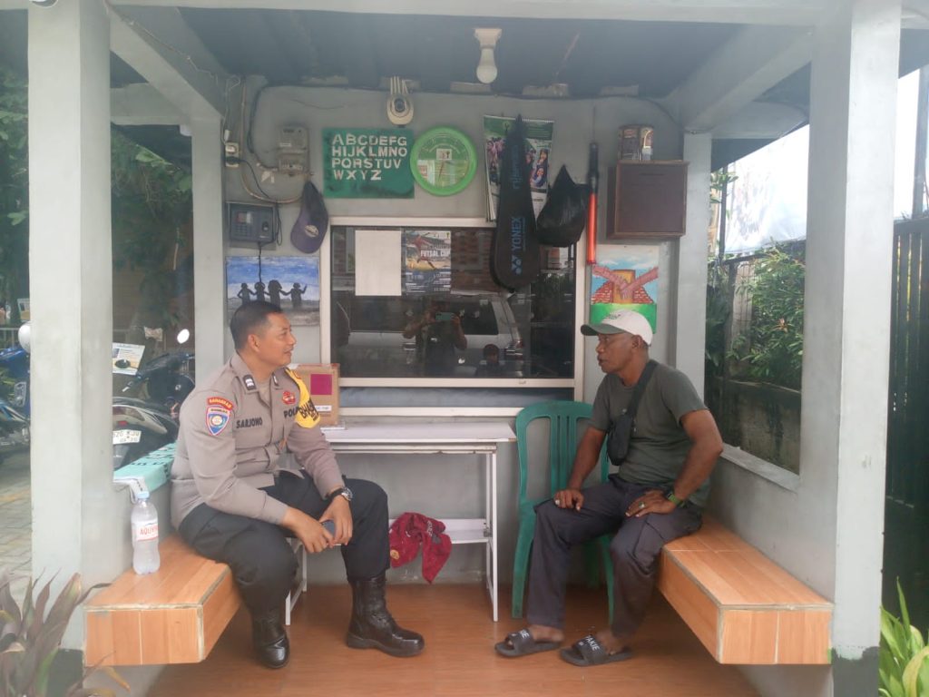 Bhabinkamtibmas Kelurahan Mustikasari, Aiptu Sarjono, S.H., melaksanakan patroli dan sambang, berdialog langsung dengan penjaga sekolah di lokasi tersebut.